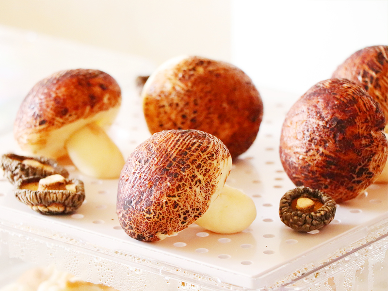4)香菇干燥后期:此期菇体内水分开始减少,游离水基本排尽,部分结合水在此期干燥过程中逐渐排掉。此阶段鲜菇体内水分移动速度明显赶不上表面蒸发速度,通风量可适当以节约能源。此期干燥温度要维持在50-55℃,和菇体内、外温度趋于一致,新风口和排风口要关闭1/2,回温孔开启1/2,干燥时间2-3小时。此期菌呈淡黄色,并开始产生香味。