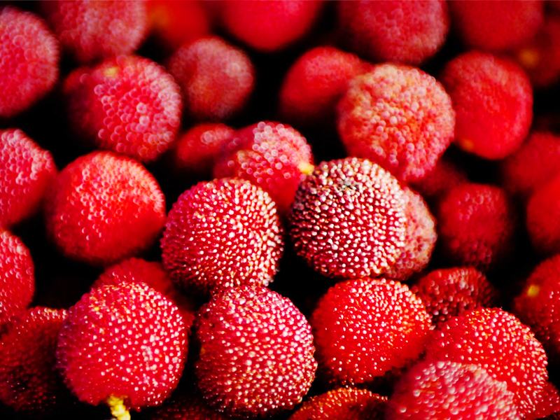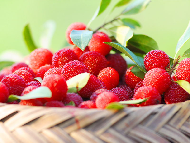 杨梅:属于木兰纲、杨梅科、杨梅属小乔木或灌木植物,又称圣生梅、白蒂梅、树梅具有很高的药用和食用价值,在中国华东和湖南、广东、广西、贵州等地区均有分布。杨梅原产中国浙江余姚,1973年余姚境内发掘新石器时代的河姆渡遗址时发现杨梅属花粉,说明在7000多年以前该地区就有杨梅生长。该属有50多个种,中国已知的有杨梅、白杨梅、毛杨梅、青杨梅和矮杨梅,经济栽培主要是杨梅。