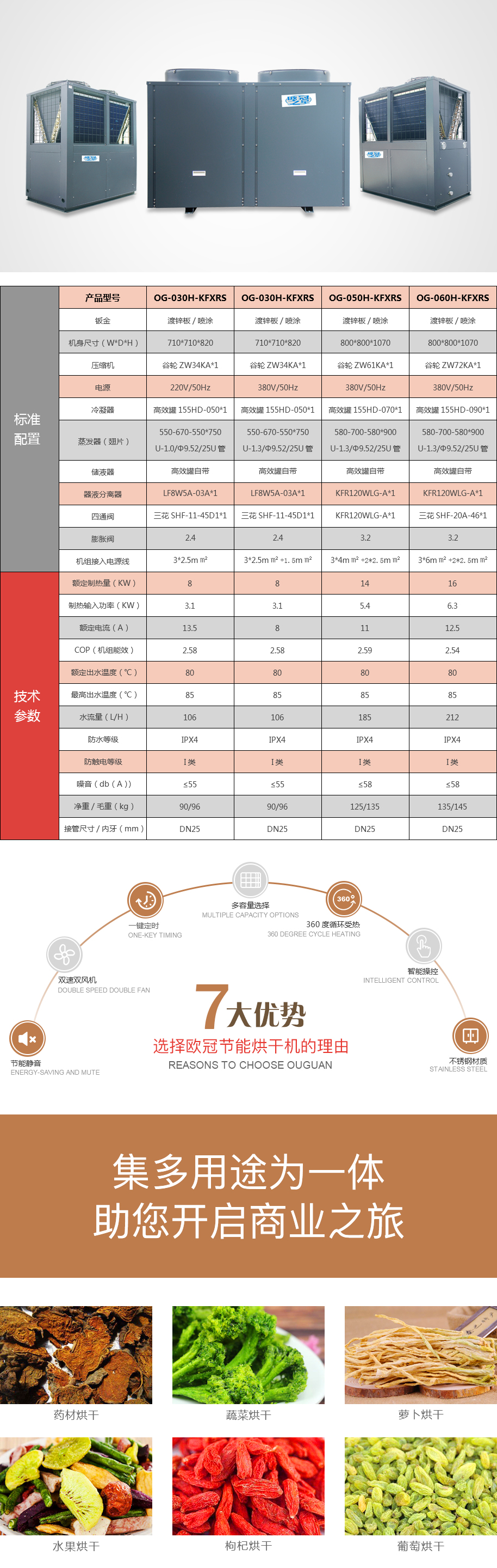 欧冠之星空气能热泵烘干属于高温烘干热泵机组,它的工作原理是:利用冷媒经过压缩机压缩,成为高温高压的气体,进入冷凝器放热,冷凝放出的热量由循环风机送入烤房,将烤房空气加热(最高出风温度可达80℃),随着空气温度升高,烘干物中的水分会逐渐蒸发,再由新风排湿系统进行排湿,从而达到烘干的效果。