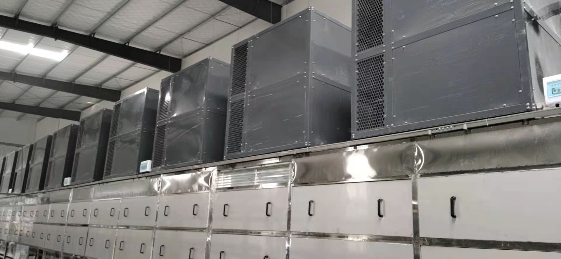 热泵烘干时空气在烘房与机组进行闭式循环,烘房内高温高湿回风空气经过冷热回收器,到达热泵的制冷系统降温脱湿,排出其中的大部分凝结水,然后在次经过冷热回收器,使进入制冷片的湿空气温度下降而进去加热片的冷空气温度上升,从而加大除湿量,相比普通的除湿机节能30%以上,脱湿后的干冷空气通过风机加压流经加热片加热,又回到烘干房继续干燥物料,从米粉表面带走水份后继续下一个循环。