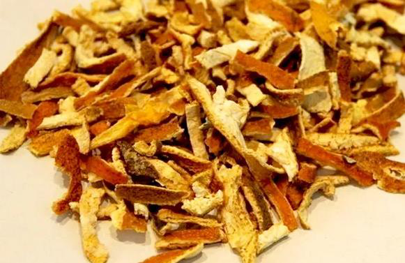 陈皮,中药名。为芸香科植物橘及其栽培变种的干燥成熟果皮。药材分为“陈皮”和“广陈皮”。采摘成熟果实,剥取果皮,晒干或低温干燥。陈皮常剥成数瓣,基部相连,有的呈不规则的片状,厚1-4毫米。陈皮外表面橙红色或红棕色,有细皱纹和凹下的点状油室,内表面浅黄白色,粗糙,附黄白色或黄棕色筋络状维管束。质稍硬而脆,气香,味辛、苦。